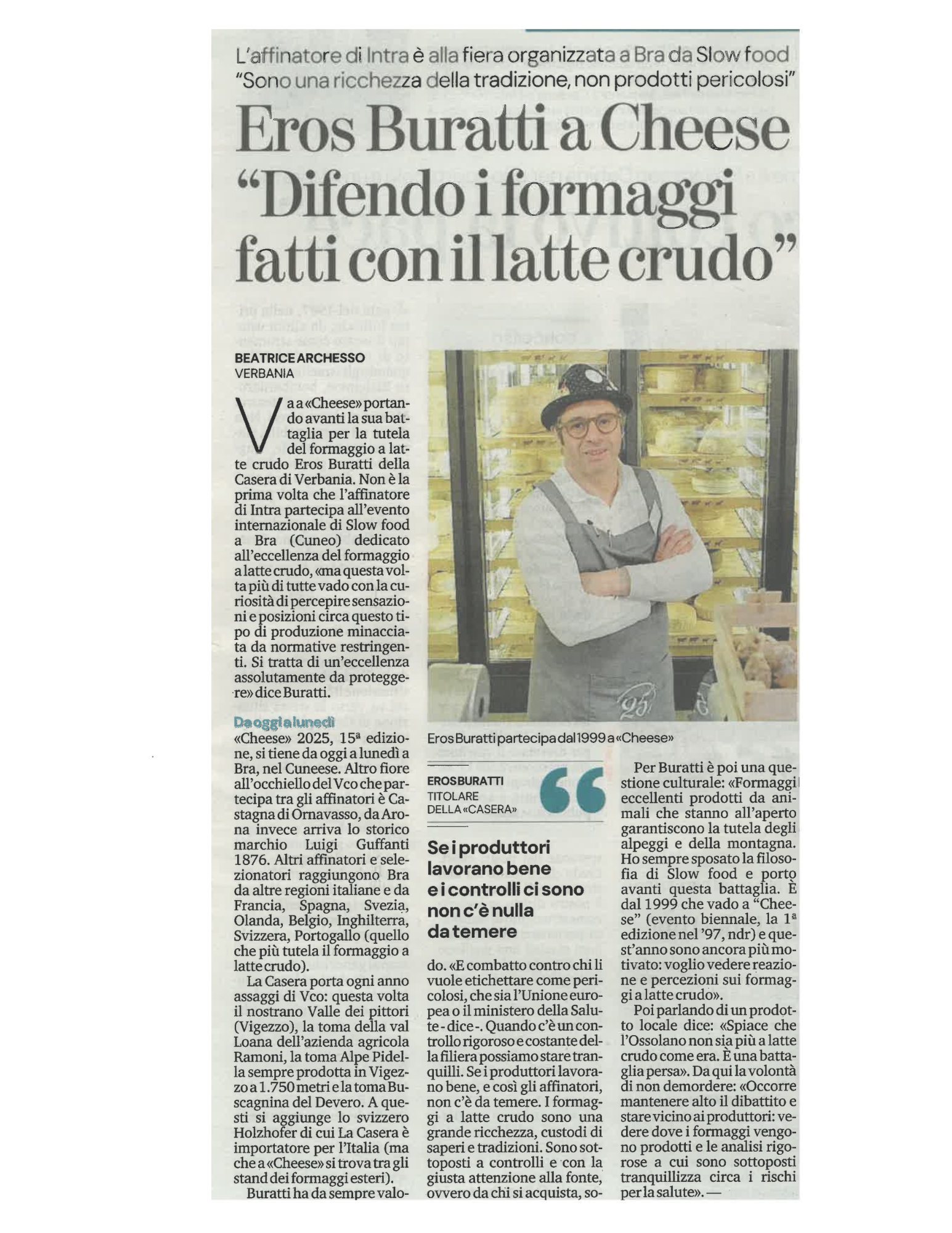 Pubblichiamo l'articolo de "La Stampa" di Venerdì 19 Settembre 2025, dove il nostro Eros difende la specificità dei formaggi a latte crudo.